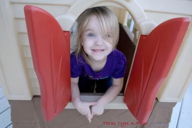 • Open floor plan. While there are cute little Dutch-style shutters on either end, the sides are open so it’s easy to monitor your child while they’re playing. We have ours set up on our deck and Cakes is always in my line of sight through the kitchen window because of how open the playhouse is.